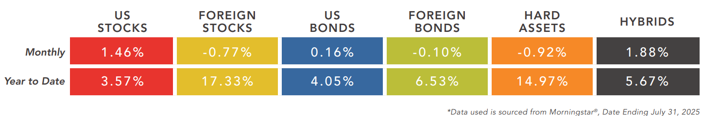 Stocks had another great month in July, continuing the rally. The job market data, specifically the downward revisions, negatively impacted markets, but stocks still had positive returns for the month. Further, leading into August, stocks have accelerated based in part on the belief that the Fed will reduce rates quite soon based on the latest CPI release. Although the impacts of tariffs are not fully known, the markets seem to be gaining clarity and confidence in the global trade landscape. Markets don’t deal well with uncertainty, so any form of clarity on this topic will likely be a good thing for stocks.