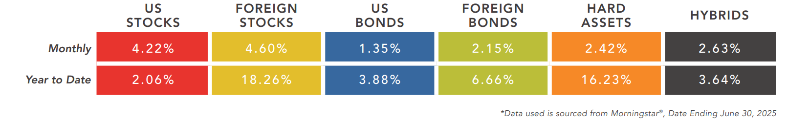 Foreign markets were up for the month of June, slightly less than comparable US stocks. However, the year-to-date returns for foreign stocks are relatively massive, in the 20% range. Foreign diversification has been a tremendous advantage in the equity markets over the last year, with global trade serving as the catalyst for this new market trend.
