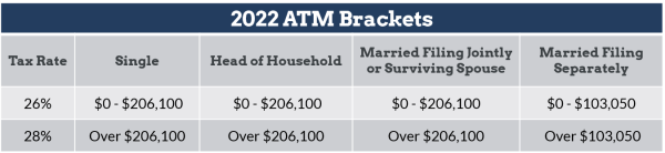Like the regular tax brackets, the AMT brackets are annually indexed for inflation. For 2022, the threshold for the 28% bracket increased by $6,200 for all filing statuses except married filing separately, which increased by half that amount.