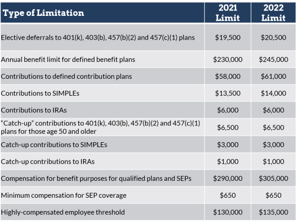 Not all of the retirement-plan-related limits increase for 2022. Thus, depending on the type of plan you have, you may have limited opportunities to increase your retirement savings if you’ve already been contributing the maximum amount allowed: